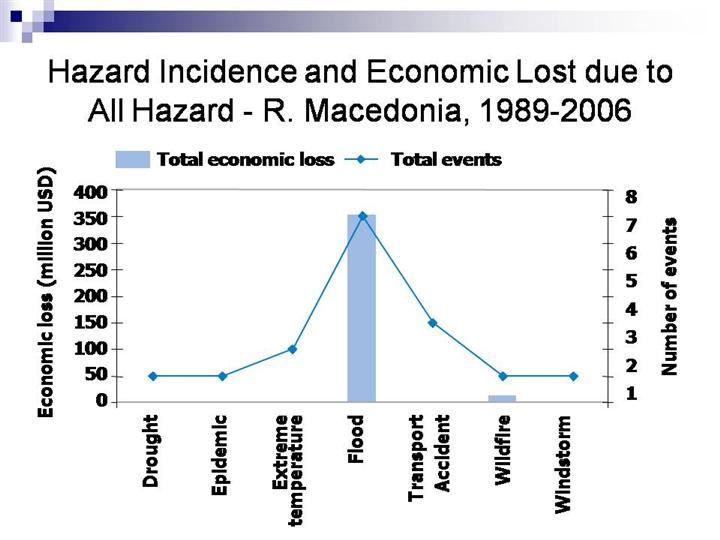 Reported economic loss is highest for floods related hazards – more than 350 millions USD. During the past two decades, no earthquake events were reported. However, this does not mean that Macedonia is not vulnerable to earthquakes. The most recent and destructive earthquake took place on July 26, 1963 and the capitol Skopje was affected. Despite this earthquake isn’t part of this study, it was with magnitude 6.1, killed 1,070 people and wounded 3,330, causing extensive damage to the city. As per the National Geophysical Data Center, earthquake has caused an economic loss of more than USD 5 million in the country during the last 33 years. Macedonia is incurring an annual average economic loss of USD 25 million (0.55 per cent of GDP). |