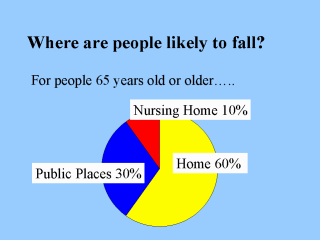 falls happen to women in their homes in the afternoon? For adults 65 years old or older, 60%of fatal falls happen at home, 30% occur in public places, and 10% occur in health care institutions. However, injury rates are more higher with 10 ~ 25% of nursing home, or long-term care facilities resulting in fracture, or sever tissue injuries (Rubenstein, 1999) Falling will tend to occur within the first few days or first weeks upon entering a nursing home or transferring to a nursing home, It may be due to unfamiliar environment. Also, person who admitting in has more chronic illness, medications, and immobility due to long time sitting or in bed (Sorock 1988; Sattin 1992). 24% of nursing home falls are due to the weakness and gait problems of the residents. Falling caused by environmental hazards is approximately 16% of nursing home fall incidence. Higher use of psychotropic drugs (e.g. antidepressants) have been associated with risk of falling. |