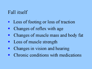 reasons that can lead to a fall besides fragile bone and force of fall. Loss of footing or loss of traction are common causes of fall. Loss of footing occurs when there is less than total contact between the person's foot and the ground or floor. Loss of traction happens when the ground upon the person is stepping is wet or slippery. Other examples of loss of traction are tripping, especially over uneven surfaces such as sidewalks, curbs or scatter rugs. A fall may occur because a person's reflexes have changed over age. When people age, reflexes slow down. Reflexes are automatic responses to stimuli in the environment. Examples of reflexes includes quickly moving out of the way when something accidentally falls. Aging slows the person's reaction time and make it harder to regain the balance following sudden movement of shift of body weight. |