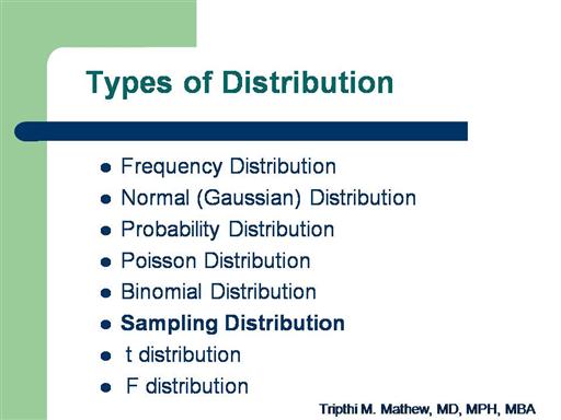 There are several types of distribution: frequency distribution, normal distribution, probability and sampling distributions. This lecture will focus on sampling distribution.