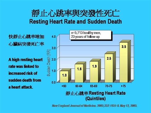 A higher resting heart rate was significantly associated with increased risk of sudden death from a heart attack. These values were adjusted for: age, smoking, physical activity, BMI, diabetes, blood pressure, cholesterol, and exercise duration. Persons with the lowest risk of sudden deaths had resting heart rates less than 60.