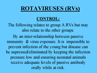 system where possible. Antibody must be present in the gut lumen to neutralize the infectivity of the virus and this requires daily feeding of colostrum. Disease occurs when passive immunity wanes (either naturally or by weaning). Diseased animals usually have good levels of circulating antibody derived from the early ingestion of maternal antibody. These are NOT protective because the pathogenesis is confined to the gut. Bovine RV: A dam vaccine is available in the UK to boost & prolong secretion of RV neutralizing antibody in colostrum/milk. Primarily for suckler beef herds but stored colostrum from vaccinated cows can be fed to dairy calves. Porcine RV: No vaccine marketed in the UK; bovine colostrum will protect piglets. Canine & Feline RVs: No vaccines thought necessary. |