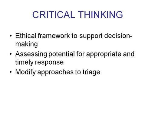 Ability to think critically and to apply an appropriate set of values and to use an ethical framework to the work involved Researcher, investigator, direct care provider, director of care in hospital, on-site coordinator of care/care management, information provider, mental health counselor