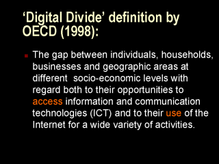 ‘digital divide’? Some people call it “Technological apartheid”. 1/2 of world population never made a phone call. Less than 6% of the world population have access to the Internet. There are more Internet hosts in New York than in continental Africa. |