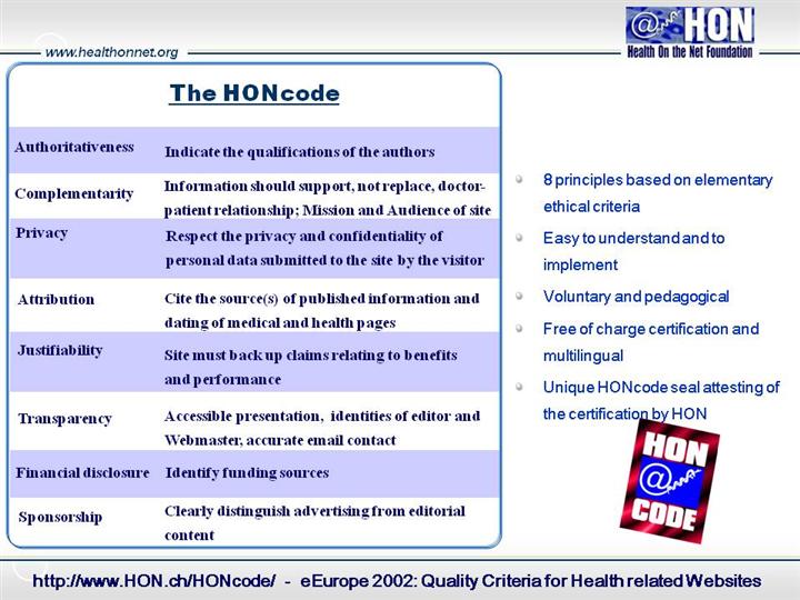 The HONcode is an easy to understand charter made up of eight principles that are simple for any well-intentioned web publisher to implement.