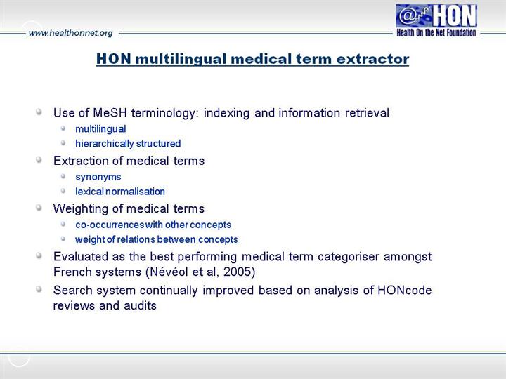 HON medical term extractor : MESH + other online dictionaries |