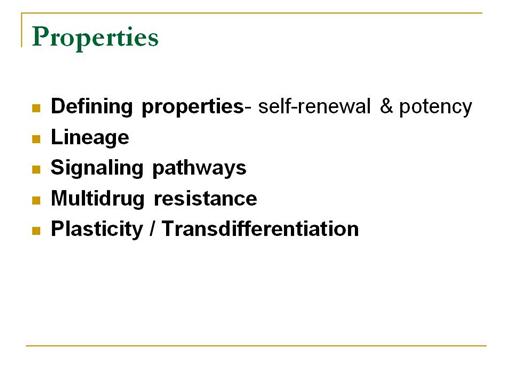 Properties of adult stem cells 2.1.1 Defining properties Self-renewal which is the ability to go through numerous cycles of cell division while maintaining the undifferentiated state. Multipotency or multidifferentiative potential which is the ability to generate progeny of several distinct cell types, (for example glial cells and neurons) as opposed to unipotency which is the term for cells that are restricted to producing a single-cell type. These properties can be shown with relative ease in vitro using methods such as clonogenic assays, where the progeny of a single cell is characterized, however, it is known that in vitro cell culture conditions can alter the behavior of cells. Proving that a particular subpopulation of cells possesses stem cell properties in vivo is challenging. 2.1.2 Lineage To ensure self-renewal, stem cells undergo two types of cell division,one is Symmetric division gives rise to two identical daughter cells, both endowed with stem cell properties, whereas asymmetric division produces only one stem cell and a progenitor cells with limited self-renewal potential. Asymmetric division is the process of a cell splitting into another cell and an essential cell fat, or a lipid , this lipid will bond to a free cell and reproduce. Progenitors can go through several rounds of cell division before finally differentiating into a mature cell. The molecular distinction between symmetric and asymmetric divisions lies in differential segregation of cell membrane proteins (such as receptors) between the daughter cells. 2.1.3 Signaling pathways Adult stem cell research has been focused on uncovering the general molecular mechanisms that control their self-renewal and differentiation. Eg: Bmi-1 , Notch , Wnt. These developmental pathways are also strongly implicated as stem cell regulators.(Beachy et al,2004). 2.1.4 Multidrug resistance Adult stem cells express transporters of the ATP-binding cassette family that actively pump a diversity of organic molecules out of the cell.(Chaudhary and Roninson,1991). Many pharmaceuticals are exported by these transporters conferring multidrug resistance onto the cell. This complicates the design of drugs, for instance neural stem cells targeted therapies for the treatment of clinical depression. 2.1.5 Plasticity Under special conditions tissue-specific adult stem cells can generate a whole spectrum of cell types of other tissues, even crossing germ layers.(Filip et al,2004). This phenomenon is referred to as stem cell transdifferentiation or plasticity. It can be induced by modifying the growth medium when stem cells are cultured in vitro or transplanting them to an organ of the body different from the one they were originally isolated from. |