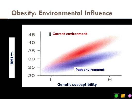 What is responsible for this sudden increase in the number of obese people in the U.S.? Obesity most likely results from an interplay between genes and the environment. However, the recent explosion in the prevalence of obesity has occurred too quickly to be explained solely by changes in our genes. One hypothesis is that, in the past, humans who were able to accumulate fat when food was plentiful were better able to survive during times of food scarcity. Now, however, in the U.S. and many other countries, food is plentiful and foods that are high in calories but often low in nutritional value tend to be relatively inexpensive. Furthermore, most people engage in far less physical activity than did previous generations. Ironically, the ability to accumulate fat during times of plenty – which was originally thought to confer a benefit – has become a detriment to our health. Research supported by the NIDDK has led to improved understanding of the factors contributing to this complex condition.