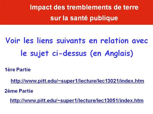 Liens utiles: Les liens suivants présentent des données intéressantes sur les retours d'expérience des tremblements de terre de Bam, en Iran, et Bhju, en Inde: