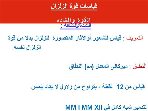 شريحه من مكتبة السوبركورس - http://www.pitt.edu/~super1/lecture/lec32361/009.htm الكثافة هي مقياس لمدى شدة الهزة كان في موقع معين ، ويتحدد بتصنيف درجة شدة الهز التي تقاس بمقياس الشدة