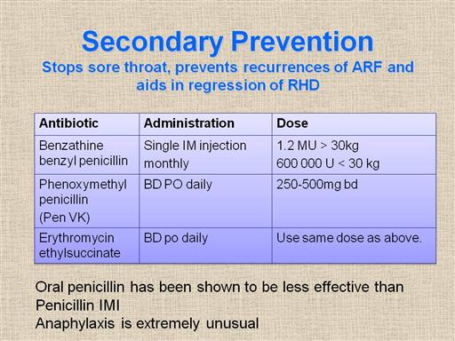 There is evidence to suggest that oral penicillin results in poorer rates of adherence and serum penicillin concentration may also be less predictable compared to intramuscular penicillin. The rate of anaphylactic reactions is about 0.2% with fatalities being extremely rare. |