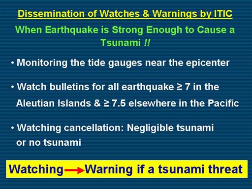 The major dissemination responsibility of the ITWS is the tsunami watch and/or warning.