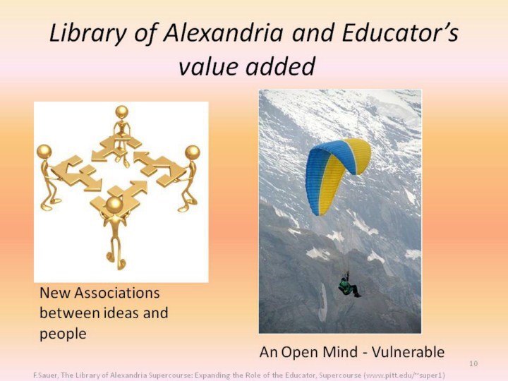 Library of Alexandria Supercourse value added Facilitate a “Just in Time” multi-disciplinary and multi-cultural approach to key topics as earthquake, flu or any major event locally as well as globally Educator’s value added as a catalyst Open student’s mind by creating new associations between ideas and between peoples in different knowledge domains. Move towards global knowledge sharing and global relationship sharing. Model the value of vulnerability to explore new possibilities. |