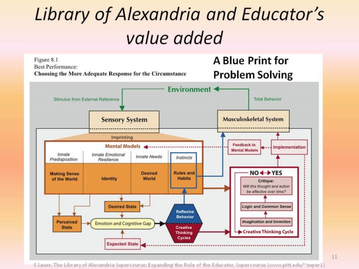 Library of Alexandria Supercourse value added Empower the educator as a role model who chooses how to best leverage the content provided by the Library of Alexandria Supercourse as a reference Educator’s value added as a catalyst Provide a blueprint for problem solving that enables the student to, with courage, access his/her own resourcefulness, to think systemically and creatively fostering an environment of respect for the opinions of others |