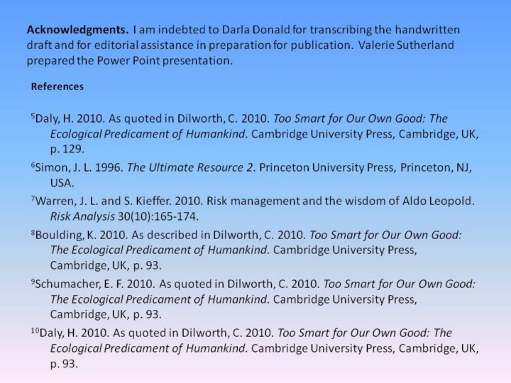 1Watson, R. T. and A. H. Zakri, co-chairs. 2005. Living Beyond Our Means: Natural Assets and Human Well-Being. Statement from the Millennium Ecosystem Assessment Board, p. 5. http://www.maweb.org/documents/document.429.aspx.pdf. 2Philpott, T. 2010. New research: synthetic nitrogen destroys soil carbon, undermines soil health. Grist 23Feb http://www.grist.org/article/2010-02-23-new-research-synthetic-nitrogen-destroys-soil-carbon-undermines-/. 3Gardner, T. 2010. Arctic melt to cost up to $24 trillion by 2050; report. Reuters 5Feb http://www.reuters.com/article/idUSTRE6145M520100205. 4Goodstein, B. 2010. As quoted in Gardner, T. 2010. Arctic melt to cost up to $24 trillion by 2050; report. Reuters 5Feb http://www.reuters.com/article/idUSTRE6145M520100205.