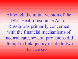 | The first issue asks whether health is valuable in itself, or only as a means for enhancing economic production; and the second assesses interrelations between various indicators of health care financing, management, quality, and general population well-being. In Russia, a private health system had to be built upon public hegemony, whereas in the United States, health reformers were grappling with the issue of how to make a private health system more responsive to public demands. |