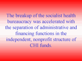 | The funds were also legislatively prevented from becoming giant providers of medical care, resembling Health Maintenance organizations. The structure of the CHI funds removed the monitoring of accountability, quality, and cost from the self-regulating private sector, and defined it as a function of public administration. |