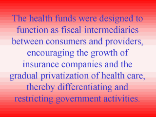 The health funds were designed to act as conduits for government subsidy of insurance premiums, purchased from insurance companies but insurance companies would be the direct fiscal agents to health care providers. Providers, rather than continue as salaried government workers, would be paid from premiums, which introduced performance incentives to medical practice.