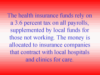 | However, large insurance monopolies have formed, leading to abuse, corruption and cost increases. Local funds are not supplemented adequately by many regions, and patients have to pay out-of-pocket in addition to the payroll tax for basic hospital care, including food, sheets and medical supplies. |