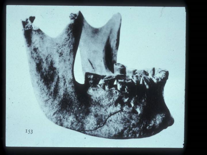 Dentistry was an important health field in ancient Egypt. Some mummies show evidence of severe infections, cavities, and loose teeth, but also teeth that were wired together and artificial prostheses, dating back at least to 2,600 B.C. This excavated jawbone from the Old Kingdom shows evidence of an ancient operation, as we can see 2 holes bored to drain an abscess. |