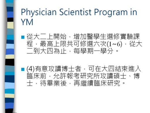 (4) those who wish to pursue doctoral can enter the senior end of the pre-clinical, to allow candidates the Institute for Master Doctor, until after graduation, to continue clinical research.