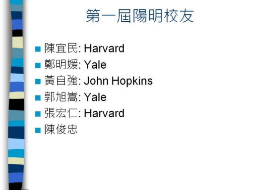 First Yangming Alumni Chen Yimin: Harvard Zheng Mingyuan: Yale Huang Ziqiang: John Hopkins Hsu-Sung Kuo: Yale Zhang Hongren: Harvard Jin-Jong Chen