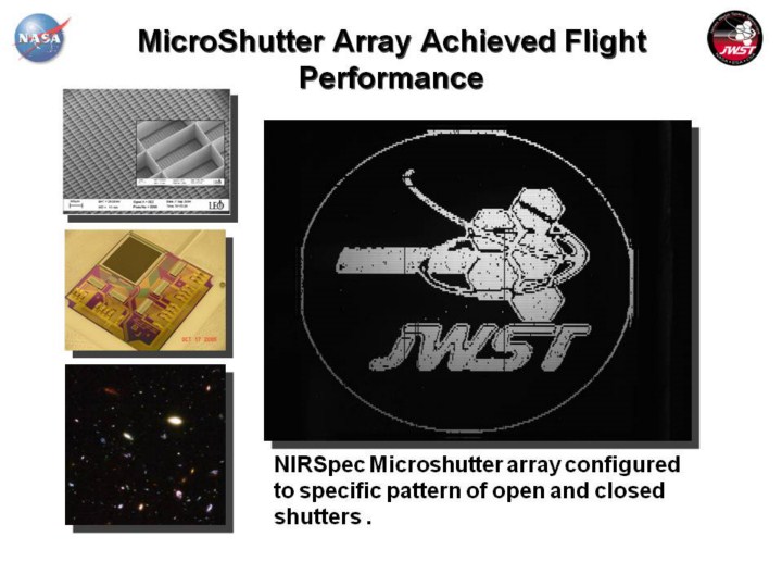 This technology enables the NIRSpec instrument of JWST to perform spectroscopy on up to 100 objects at a time. Microshutters provides giant step beyond fixed slit spectroscopy in that this technology will permit faster mapping and cataloging of faint infrared objects due to the number of objects that can be imaged at one time.