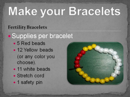 We have found it is better to assemble the bracelets before you teach the class and give them to the women ready-made. We have found from our experience that women were too distracted making bracelets and listening to the class at the same time. Some people found that the color of beads were helpful. Red symbolized menses whereas white was purity. Yellow could mean caution…but any color does well here. The next slide starts the presentations for your patients. |