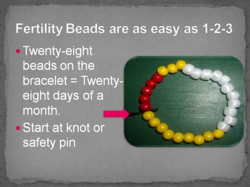 Typically, a women has 28 days in her menstrual cycle (Adjust as needed). So there should be 28 beads on your bracelet. Start at the knot or pin and then to the first red bead. “ALWAYS” go towards the three yellow beads (or other color you select). Say “Fertility Beads are as easy as 1-2-3” to help your patient remember. |
