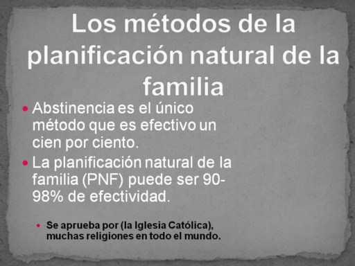 Abstinencia es el único método que es efectivo un cien por ciento. La planificación natural de la familia (PNF) puede ser 90-98% de efectividad Se aprueba por (la Iglesia Católica),muchas religiones en todo el mundo.