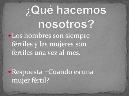 ¿Qué hacemos nosotros? Los hombres son siempre fértiles y las mujeres son fértiles una vez al mes. Respuesta =Cuando es una mujer fértil? |