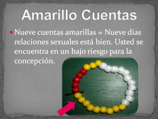 Nueve cuentas amarillas = Nueve días relaciones sexuales está bien. Usted se encuentra en un bajo riesgo para la concepción.