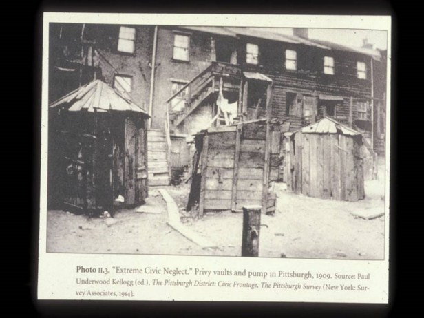 1909 Pittsburgh, PA housing and privy vaults and waste dump for the typical working family. This basic lack of sanitation lead to a high disease rates among the workers and their families. |
