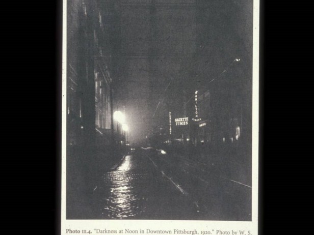 1920-darkness at high noon in downtown Pittsburgh on a typical day. White collar workers had to take at least a second white shirt to work daily because of the ever present dirt. |