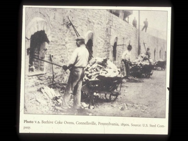 1890’s Connellsville, PA beehive coke ovens-worker wearing no protective goggles nor clothing.
