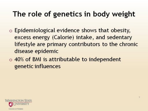 Formal genetic data based on twin, adoption, and family studies lead to the conclusion that at least 50% of the interindividual variance of the BMI is due to genetic factors. Hebebrand J, Hinney A. Environmental and genetic risk factors in obesity. Child Adolesc Psychiatr Clin N Am. 2009 Jan;18(1):83-94. |