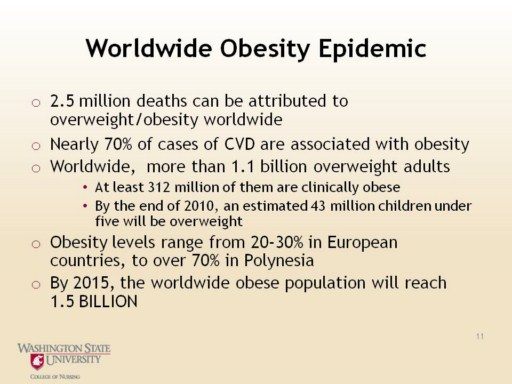 Obesity predisposes us to Reduced quality of life Asthma (in overweight children) Psychosocial problems Higher overall mortality Premature death from lifestyle-related, chronic non-communicable diseases (e.g., CVD, diabetes, etc)