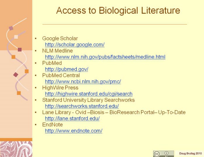 Google Scholar NLM Medline http://www.nlm.nih.gov/pubs/factsheets/medline.html PubMed PubMed Central http://www.ncbi.nlm.nih.gov/pmc/ HighWire Press http://highwire.stanford.edu/cgi/search Stanford University Library Searchworks http://searchworks.stanford.edu/ Lane Library - Ovid –Biosis – BioResearch Portal– Up-To-Date EndNote |