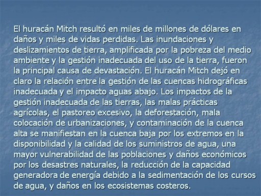 El huracán Mitch también demostró el nexo entre la pobreza, la degradación ambiental y la vulnerabilidad a los desastres naturales, que provocan pobreza aún mayor. |