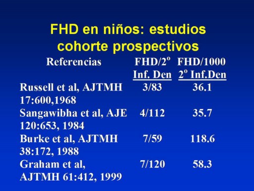 En 3 de 4 estudios cohorte, la incidencia de enfermedad reconocida como severa, variķ entre 3.5 y 6% de infecciones secundarias de dengue. Estos estudios se realizaron en un periodo de 30 aņos en poblaciones diferentes y con diferentes virus circulando.