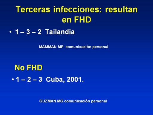 En Cuba, infecciones secuenciales con dengue tipos 1,2 y 3 ocurrieron en 1977-79, 1981 y 2000-2001, respectivamente. Casos severos acompañados de una infección tercera del dengue no fueron detectados.