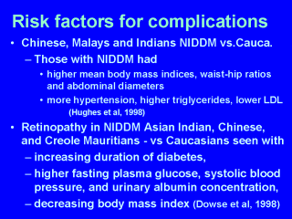 glucose, SBP and albuminuria. BMI decreased (highest in Indians, lowest in Mauritians). So, among these three groups, Chinese were intermediate between Indians (who had highest markers) and Caucasians (who had lowest markers) in terms of indices of complications and risk factors. Can you think what factors might account for such differences? |