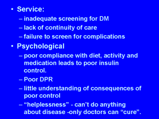 important problem lies with medical practitioners. This issue is three-fold. First, many doctors do not screen patients for DM opportunistically. They only treat the symptom that brought the patient to them. They do not perform preventive activities, such as screening because there is not motive for them to do so. Second, once DM is detected, many practitioners still fail to provide sufficient information in a way that is accessible and retainable by patients. Patients may be told they have DM, they may have an explanation of what that means, and they may have some recollection of the information given. However, it is likely that at each of these nodes there is breakdown of communication, understanding or retention. In other words, patients don’t fully comprehend what it means to have DM or that lifestyle change is necessary, not optional. Third, there is often a failure to screen patients for complications by medical practitioners. Because patients can visit any medical practitioner, there is no continuity of care. Breakdown in continuity of care means that it may be many years between screening checks for retinopathy or foot deterioration. Patients may only present when symptoms become apparent, usually by which time the damage is done. Patients who do not fully appreciate the requirements for adherence to dietary, exercise and medication are less likely to comply. They may be anxious about their diagnosis, or find it difficult to adopt a changed lifestyle when all their family members continue and expect their usual lifestyle. There may be a poor doctor-patient relationship and low satisfaction with quality of care. Finally, patients may not realise the consequences of adherence to lifestyle and treatment, or find themselves unable to give up favorite foods, for example. |