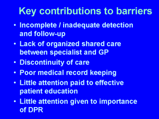 aspects? There are a number of key service factors that pose barriers to good prevention of complications. These include: 1. Incomplete/inadequate screening for DM, poor follow-up of cases detected. 2. Once a general practitioner refers a patient to specialist care, many patients are not referred back to the practitioner. The practitioner may not hear any more about the patient, and assume they are being taken care of. (This is often because endocrinologists do not trust their GP colleagues, in part because of the poor postgraduate training in Hong Kong in primary care.) 3. Both clinic and GP may assume the other is doing the monitoring. Poor communication and liaison regarding shared care is a major factor in breakdown of continuity of care. 4. Medical records are often inadequate and do not enable patients to take information from doctor to doctor. Patient-held records would be helpful here but are opposed by the profession because of fears about liability and patients "finding out too much". 5. Patient education has a low priority, is of little interest among doctors and nurse who feel too busy with "real medicine" to carefully educate patients about their care and address their questions. Specialist Diabetic Nurses can help here. 6. Many doctors fail to appreciate the importance of the doctor-patient relationship in achieving adherence. Autocratic and paternalistic attitudes still predominate among many practitioners. |