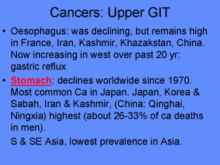 look at common cancers of the upper, mid and lower GI tract. Cancer of the oesophagus is a common cancer which has been showing variable patterns of change worldwide. There is a high prevalence of oesophageal cancers in what is called the "crescent", a geographic range which stretches through Iran, Kashmir, Khazakstan and into China. Rates are also high in parts of France. While rates have been low for some years in the UK, they have shown an increase over the past decade. Some researchers have attributed this to increasing use of H2 receptor antagonists for stomach ulcers. Others have linked it to the prevalence of Helicobacter Pylori, though some evidence suggests childhood H.P. infection may lead to distal gastric adenocarcinomas, but be protective against some forms of cancer of the proximal stomach and oesphageal juncture, (Williams & Pounder, Am-J-Gastroenterol. 1999). Cancers of the stomach have been declining in incidence worldwide over the past 30 years, with particularly notable declines in Japan and Korea, where stomach cancer remains the most prevalent cancer among men. In China, rates are highest in Qinghai and Ningxia, accounting for between one quarter to one third of cancer diseases among men. South and south-east Asia have the lowest prevalence of gastric cancers within Asia |