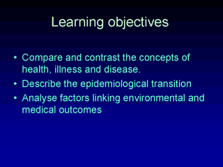 from a number of different dimensions. You must recognize and describe epidemiological transitions. Finally, you need to be able to analyse factors that might link environmental and medical outcomes. This is a lot of “stuff” to cover. It isn’t possible to address it all in a one hour lecture. These notes therefore supplement, and provide a background to what will be presented in the lecture. You are strongly encouraged to read and think about these notes in advance of the lecture itself. |