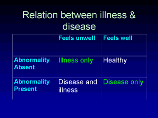 differentiates between disease and illness. Abnormalities may be present or absent,