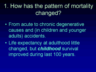 mortality changed in HK since 1900? From the chart of mortality in HK for 1912, 1948 and 1999 (slide 14) we can see that the change has been from acute, mainly infectious diseases, to chronic, degenerative conditions. The chart of life expectancy (slide 15) is misleading, because it represent the average number of years of life expectancy at birth. Averages are disproportionately affected by extreme scores. The apparent gains in years of life expectancy reflect a drop in deaths among children, mostly in the 0-5 years age group. The high proportions of deaths in these groups up to the early to mid 19th Century pulled the average years of expected life down quite sharply. Once childhood mortality began to fall, the average years of life expectancy increased, more closely reflecting the life expectancy of those who managed to survive the vulnerable years of childhood. In fact, the life expectancy for a male aged 40 has increased only by about 3-5 years over the past 100 years. Smaller families, and from the post-WWI years onwards, gradual improvements in maternal care, have helped reduced maternal-related mortality , the major cause of premature death among women in the UK up to and during the 19th Century. |