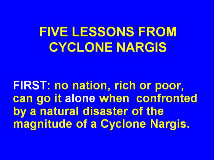 FIFTH: Nargis demonstrated the extraordinary resilience of the Myanmar people, who, in this case, overcame huge odds against survival. |