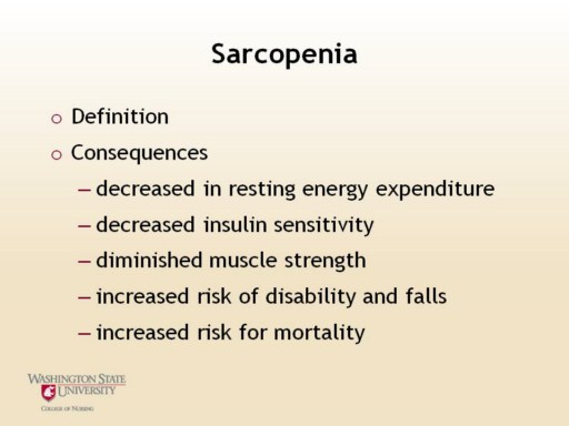 There is usually not a change in total body weight. Consequences of sarcopenia are: decreased in resting energy expenditure decreased insulin sensitivity diminished muscle strength increased risk of disability and falls increased risk for mortality